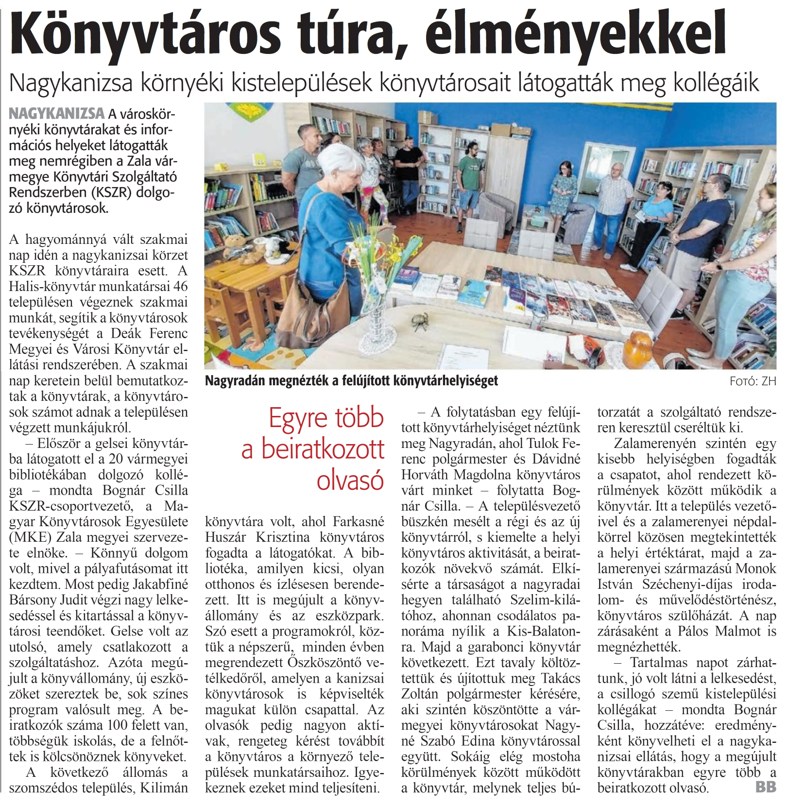 Nyilvános 866 | 1208 | Zalai Hírlap 2024. július 12. 161. szám 2. oldal | Könyvtáros túra, élményekkel NAGYKANIZSA A városkörnyéki könyvtárakat és információs helyeket látogatták meg nemrégiben a Zala vármegye Könyvtári Szolgáltató Rendszerben (KSZR) dolgozó könyvtárosok. A hagyománnyá vált szakmai nap idén a nagykanizsai körzet KSZR könyvtáraira esett. A Halis-könyvtár munkatársai 46 településen végeznek szakmai munkát, segítik a könyvtárosok tevékenységét a Deák Ferenc Megyei és Városi Könyvtár ellátási rendszerében. A szakmai nap keretein belül bemutatkoztak a könyvtárak, a könyvtárosok számot adnak a településen végzett munkájukról. - Először a gelsei könyvtárba látogatott el a 20 vármegyei bibliotékában dolgozó kolléga - mondta Bognár Csilla KSZR-csoportvezető, a Magyar Könyvtárosok Egyesülete (MKE) Zala megyei szervezete elnöke. - Könnyű dolgom volt, mivel a pályafutásomat itt kezdtem. Most pedig Jakabfiné Bársony Judit végzi nagy lelkesedéssel és kitartással a könyvtárosi teendőket. Gelse volt az utolsó, amely csatlakozott a szolgáltatáshoz. Azóta megújult a könyvállomány, új eszközöket szereztek be, sok színes program valósult meg. A beiratkozok száma 100 felett van, többségük iskolás, de a felnőttek is kölcsönöznek könyveket. A következő állomás a szomszédos település, Kilimán könyvtára volt, ahol Farkasné Huszár Krisztina könyvtáros fogadta a látogatókat. A bibliotéka, amilyen kicsi, olyan otthonos és ízlésesen berendezett. Itt is megújult a könyvállomány és az eszközpark. Szó esett a programokról, köztük a népszerű, minden évben megrendezett Oszköszöntő vetélkedőről, amelyen a kanizsai könyvtárosok is képviselték magukat külön csapattal. Az olvasók pedig nagyon aktívak, rengeteg kérést továbbít a könyvtáros a környező települések munkatársaihoz. Igyekeznek ezeket mind teljesíteni. - A folytatásban egy felújított könyvtárhelyiséget néztünk meg Nagyradán, ahol Tulok Ferenc polgármester és Dávidné Horváth Magdolna könyvtáros várt minket - folytatta Bognár Csilla. - A településvezető büszkén mesélt a régi és az új könyvtárról, s kiemelte a helyi könyvtáros aktivitását, a beiratkozok növekvő számát. Elkísérte a társaságot a nagyradai hegyen található Szelim-kilá-tóhoz, ahonnan csodálatos panoráma nyílik a Kis-Balatonra. Majd a garabonci könyvtár következett. Ezt tavaly költöztettük és újítottuk meg Takács Zoltán polgármester kérésére, aki szintén köszöntötte a vármegyei könyvtárosokat Nagyné Szabó Edina könyvtárossal együtt. Sokáig elég mostoha körülmények között működött a könyvtár, melynek teljes bútorzatát a szolgáltató rendszeren keresztül cseréltük ki. Zalamerenyén szintén egy kisebb helyiségben fogadták a csapatot, ahol rendezett körülmények között működik a könyvtár. Itt a település vezetőivel és a zalamerenyei népdalkörrel közösen megtekintették a helyi értéktárat, majd a zalamerenyei származású Monok István Széchenyi-díjas irodalom- és művelődéstörténész, könyvtáros szülőházát. A nap zárásaként a Pálos Malmot is megnézhették. - Tartalmas napot zárhattunk, jó volt látni a lelkesedést, a csillogó szemű kistelepülési kollégákat - mondta Bognár Csilla, hozzátéve: eredményként könyvelheti el a nagykanizsai ellátás, hogy a megújult könyvtárakban egyre több a beiratkozott olvasó. BB |