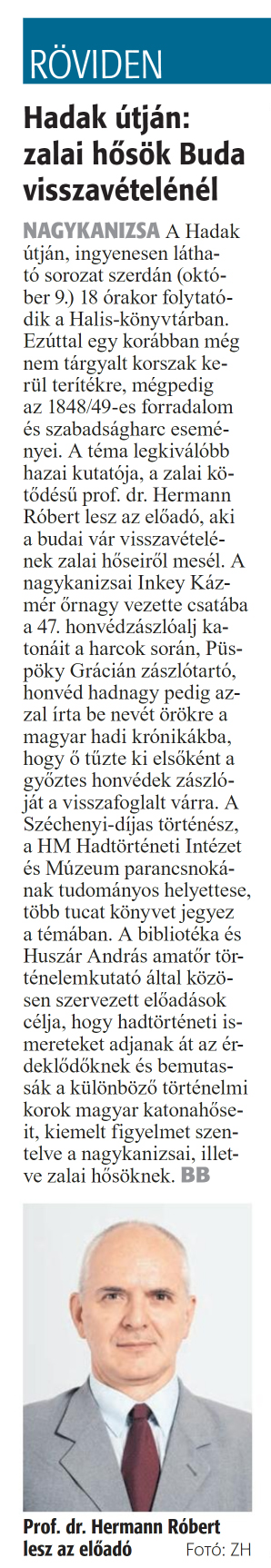 Nyilvános 840 | 1043 | Zalai Hírlap 2024. október 7. 234. szám 2. oldal | RÖVIDEN Hadak útján: zalai hősök Buda visszavételénél NAGYKANIZSA A Hadak útján, ingyenesen látható sorozat szerdán (október 9.) 18 órakor folytatódik a Halis-könyvtárban. Ezúttal egy korábban még nem tárgyalt korszak kerül terítékre, mégpedig az 1848/49-es forradalom és szabadságharc eseményei. A téma legkiválóbb hazai kutatója, a zalai kötődésű prof. dr. Hermann Róbert lesz az előadó, aki a budai vár visszavételének zalai hőseiről mesél. A nagykanizsai Inkey Kázmér őrnagy vezette csatába a 47. honvédzászlóalj katonáit a harcok során, Püspöky Grácián zászlótartó, honvéd hadnagy pedig azzal írta be nevét örökre a magyar hadi krónikákba, hogy ő tűzte ki elsőként a győztes honvédek zászlóját a visszafoglalt várra. A Széchenyi-díjas történész, a HM Hadtörténeti Intézet és Múzeum parancsnokának tudományos helyettese, több tucat könyvet jegyez a témában. A bibliotéka és Huszár András amatőr történelemkutató által közösen szervezett előadások célja, hogy hadtörténeti ismereteket adjanak át az érdeklődőknek és bemutassák a különböző történelmi korok magyar katonahőseit, kiemelt figyelmet szentelve a nagykanizsai, illetve zalai hősöknek. BB Prof. dr. Hermann Róbert lesz az előadó Fotó: ZH |