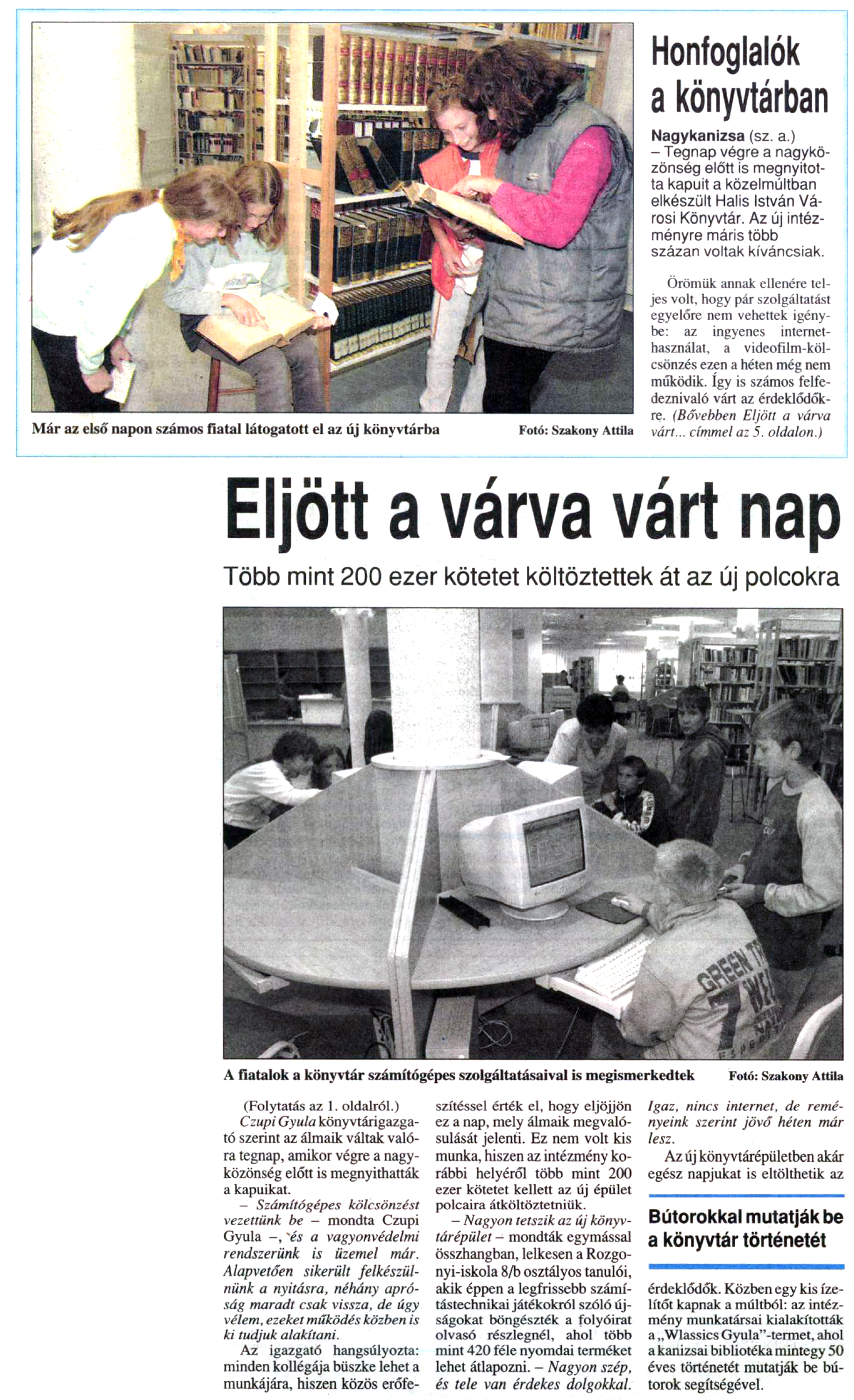Nyilvános 937 | 1054 | Zalai Hírlap 2001. október 2. 230. szám 1, 5. oldal | Már az első napon számos fiatal látogatott el az új könyvtárba Fotó: Szakony Attila Honfoglalók a könyvtárban Nagykanizsa (sz. a.) - Tegnap végre a nagyközönség előtt is megnyitotta kapuit a közelmúltban elkészült Halis István Városi Könyvtár. Az új intézményre máris több százan voltak kíváncsiak. Örömük annak ellenére teljes volt, hogy pár szolgáltatást egyelőre nem vehettek igénybe: az ingyenes internethasználat, a videofilm-kölcsönzés ezen a héten még nem működik. így is számos felfe-deznivaló várt az érdeklődőkre. (Bővebben Eljött a várva várt... címmel az 5. oldalon.) Eljött a várva várt nap Több mint 200 ezer kötetet költöztettek át az új polcokra A fiatalok a könyvtár számítógépes szolgáltatásaival is megismerkedtek Fotó: Szakony Attila (Folytatás az 1. oldalról.) Czupi Gyula könyvtárigazgató szerint az álmaik váltak valóra tegnap, amikor végre a nagyközönség előtt is megnyithatták a kapuikat. - Számítógépes kölcsönzést vezettünk be - mondta Czupi Gyula -, és a vagyonvédelmi rendszerünk is üzemel már. Alapvetően sikerült felkészülnünk a nyitásra, néhány apróság maradt csak vissza, de úgy vélem, ezeket működés közben is ki tudjuk alakítani. Az igazgató hangsúlyozta: minden kollégája büszke lehet a munkájára, hiszen közös erőfeszítéssel érték el, hogy eljöjjön ez a nap, mely álmaik megvalósulását jelenti. Ez nem volt kis munka, hiszen az intézmény korábbi helyéről több mint 200 ezer kötetet kellett az új épület polcaira átköltöztetniük. — Nagyon tetszik az új könyvtárépület - mondták egymással összhangban, lelkesen a Rozgonyi-iskola 8/b osztályos tanulói, akik éppen a legfrissebb számítástechnikai játékokról szóló újságokat böngészték a folyóirat olvasó részlegnél, ahol több mint 420 féle nyomdai terméket lehet átlapozni. - Nagyon szép, és tele van érdekes dolgokkal. Igaz, nincs internet, de reményeink szerint jövő héten már lesz. Az új könyvtárépületben akár egész napjukat is eltölthetik az érdeklődők. Közben egy kis ízelítőt kapnak a múltból: az intézmény munkatársai kialakították a „Wlassics Gyula"-termet, ahol a kanizsai bibliotéka mintegy 50 éves történetét mutatják be bútorok segítségével. |