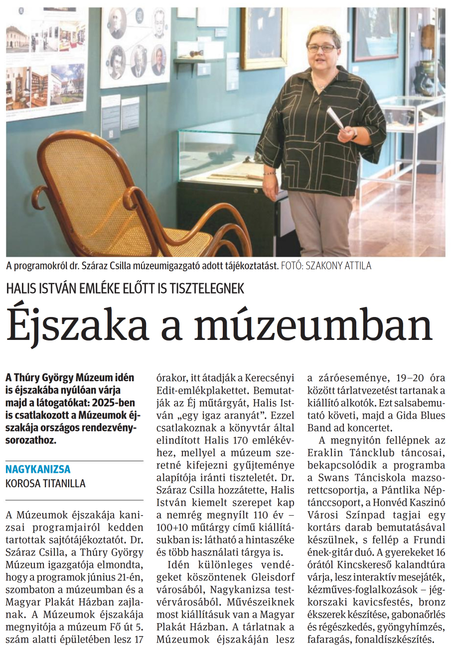 Nyilvános 782 | 1249 | Zalai Hírlap 2025. június 18. 139. szám 3. oldal | HALIS ISTVÁN EMLÉKE ELŐTT IS TISZTELEGNEK Éjszaka a múzeumban A Thúry György Múzeum idén is éjszakába nyúlóan várja majd a látogatókat: 2025-ben is csatlakozott a Múzeumok éjszakája országos rendezvénysorozathoz. NAGYKANIZSA KOROSA TITANILLA A Múzeumok éjszakája kanizsai programjairól kedden tartottak sajtótájékoztatót. Dr. Száraz Csilla, a Thúry György Múzeum igazgatója elmondta, hogy a programok június 21-én, szombaton a múzeumban és a Magyar Plakát Házban zajlanak. A Múzeumok éjszakája megnyitója a múzeum Fő út 5. szám alatti épületében lesz 17 órakor, itt átadják a Kerecsényi Edit-emlékplakettet. Bemutatják az Éj műtárgyát, Halis István „egy igaz aranyát". Ezzel csatlakoznak a könyvtár által elindított Halis 170 emlékévhez, mellyel a múzeum szeretné kifejezni gyűjteménye alapítója iránti tiszteletét. Dr. Száraz Csilla hozzátette, Halis István kiemelt szerepet kap a nemrég megnyílt 110 év -100+10 műtárgy című kiállításukban is: látható a hintaszéke és több használati tárgya is. Idén különleges vendégeket köszöntenek Gleisdorf városából, Nagykanizsa testvérvárosából. Művészeiknek most kiállításuk van a Magyar Plakát Házban. A tárlatnak a Múzeumok éjszakáján lesz a záróeseménye, 19-20 óra között tárlatvezetést tartanak a kiállító alkotók. Ezt salsabemu-tató követi, majd a Gida Blues Band ad koncertet. A megnyitón fellépnek az Eraklin Táncklub táncosai, bekapcsolódik a programba a Swans Tánciskola mazso-rettcsoportja, a Pántlika Néptánccsoport, a Honvéd Kaszinó Városi Színpad tagjai egy kortárs darab bemutatásával készülnek, s fellép a Frundi ének-gitár duó. A gyerekeket 16 órától Kincskereső kalandtúra várja, lesz interaktív mesejáték, kézműves-foglalkozások - jégkorszaki kavicsfestés, bronz ékszerek készítése, gabonaőrlés és régészkedés, gyöngyhímzés, fafaragás, fonaldíszkészítés. A programokról dr. Száraz Csilla múzeumigazgató adott tájékoztatást. FOTÓ: SZAKONY ATTILA |