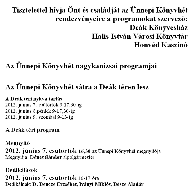 Nyilvános 1232 | 2503 | Tisztelettel hívja Önt és családját az Ünnepi Könyvhét rendezvényeire a programokat szervező: | Deák Könyvesház Halis István Városi Könyvtár Honvéd Kaszinó Az Ünnepi Könyvhét nagykanizsai programjai Az Ünnepi Könyvhét sátra a Deák téren lesz A Deák téri nyitva tartás 2012. június 7. csütörtök 9-17,30-ig 2012. június 8.péntek 9-17,30-ig 2012. június 9. szombat 9-13-ig A Deák téri program Megnyitó 2012. június 7. csütörtök 16,30 az Ünnepi Könyvhét megnyitója Megnyitja: Dénes Sándor alpolgármester Dedikálások 2012. június 7. csütörtök 16-17 óra Dedikálnak: D. Bencze Erzsébet, Iványi Miklós, Bősze Aladár |
