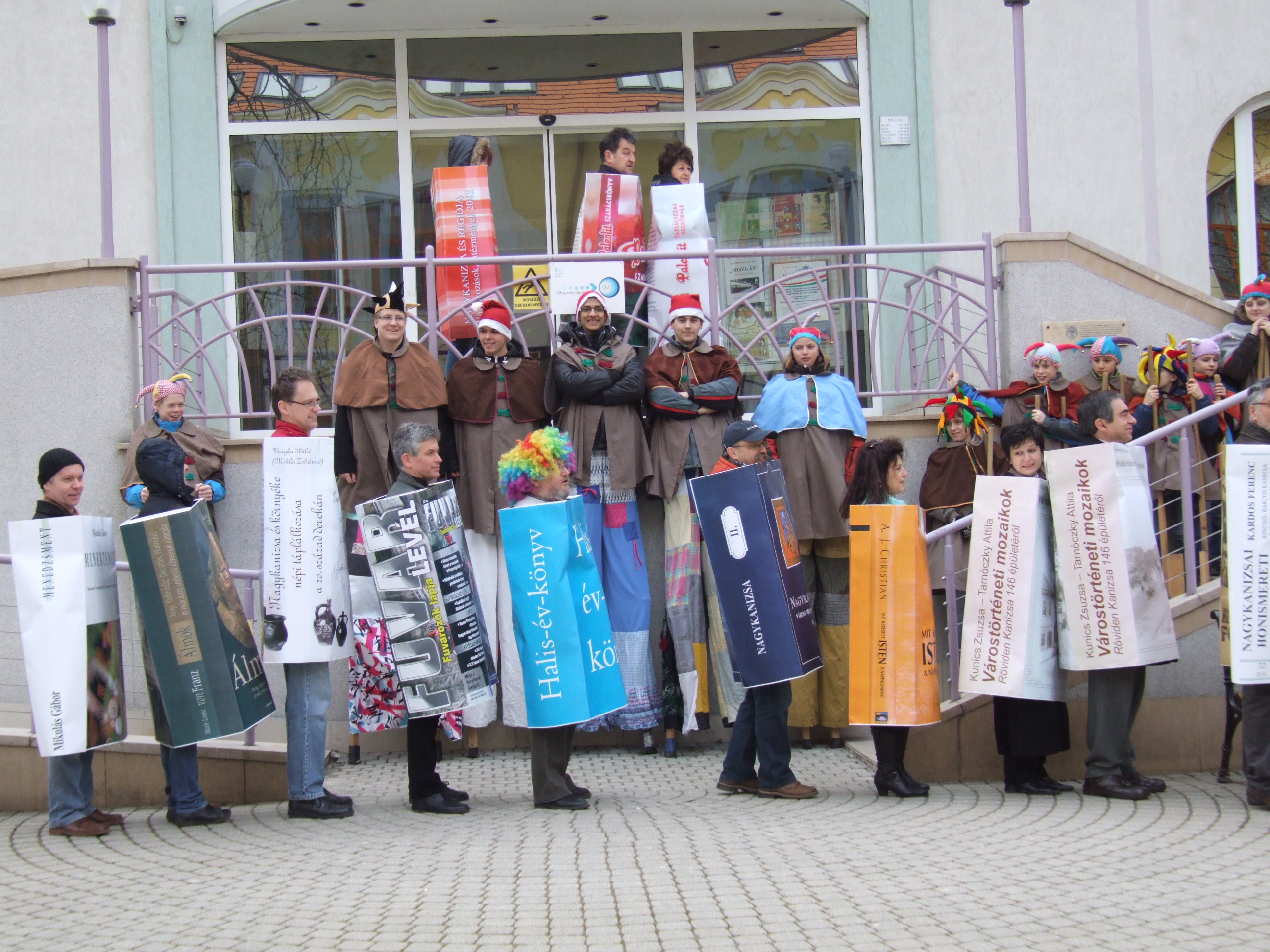 Nyilvános 1386 | 2980 | Rövid leírás | Teljes leírás (446 B) | 2013. február 9. A farsangi fánkfesztiválra készülve felhívásban kértük olvasóinkat, hogy öltsék magukra kedves könyvüket. Egy „könyvespolcnyi” jelentkező vette magára kedves olvasmányát, az ő vonulásukról készültek ezek a képek. A környezetükben néhol láthatók a Nagykanizsai Gólyalábasok, akik szintén a könyvtárhoz kötődnek. A „felvonuló kötetek” a könyvtár épületében még megtekinthetők. |