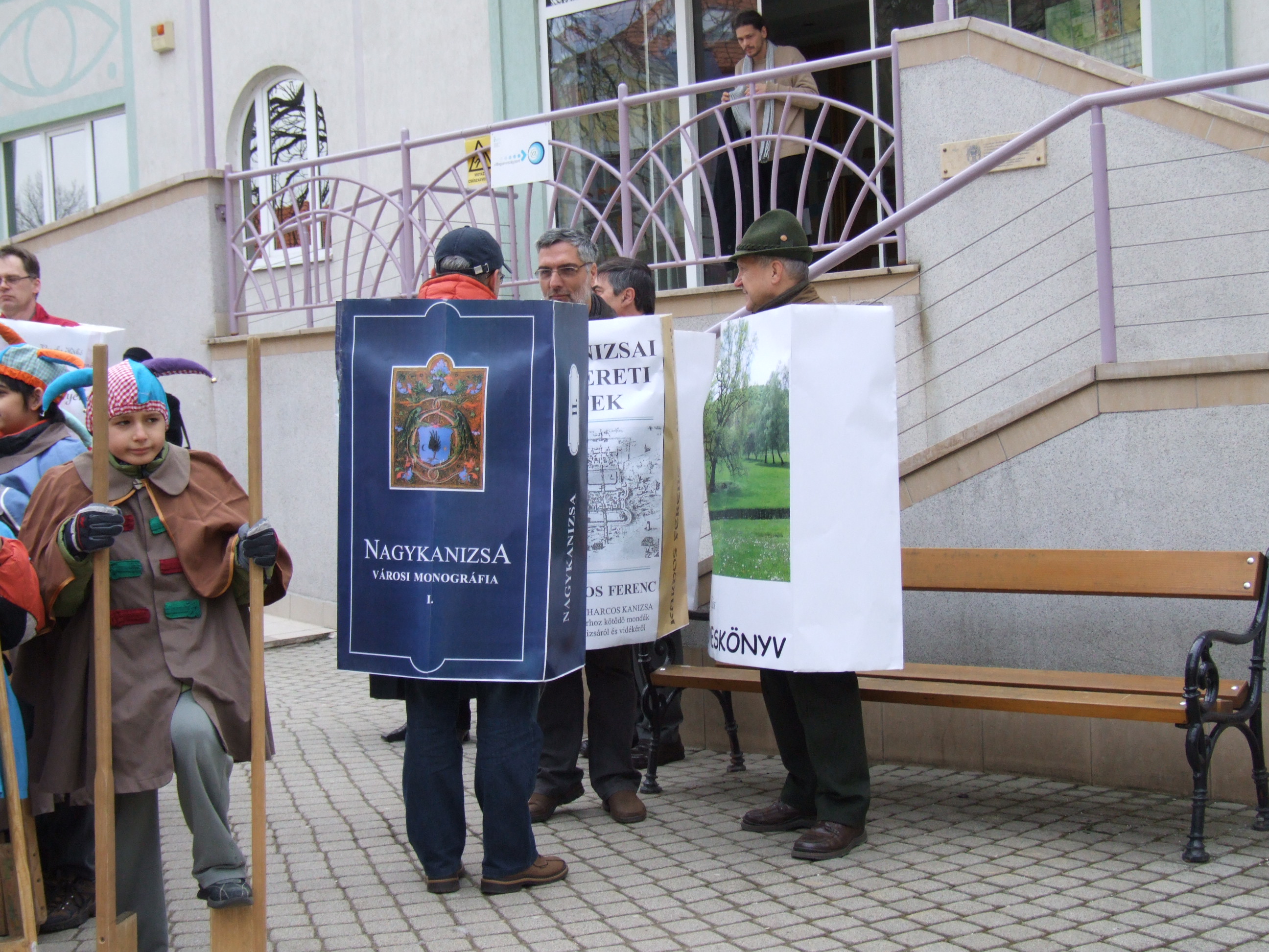 Nyilvános 1381 | 2862 | 2013. február 9. A farsangi fánkfesztiválra készülve felhívásban kértük olvasóinkat, hogy öltsék magukra kedves könyvüket. Egy „könyvespolcnyi” jelentkező vette magára kedves olvasmányát, az ő vonulásukról készültek ezek a képek. A környezetükben néhol láthatók a Nagykanizsai Gólyalábasok, akik szintén a könyvtárhoz kötődnek. A „felvonuló kötetek” a könyvtár épületében még megtekinthetők. | |