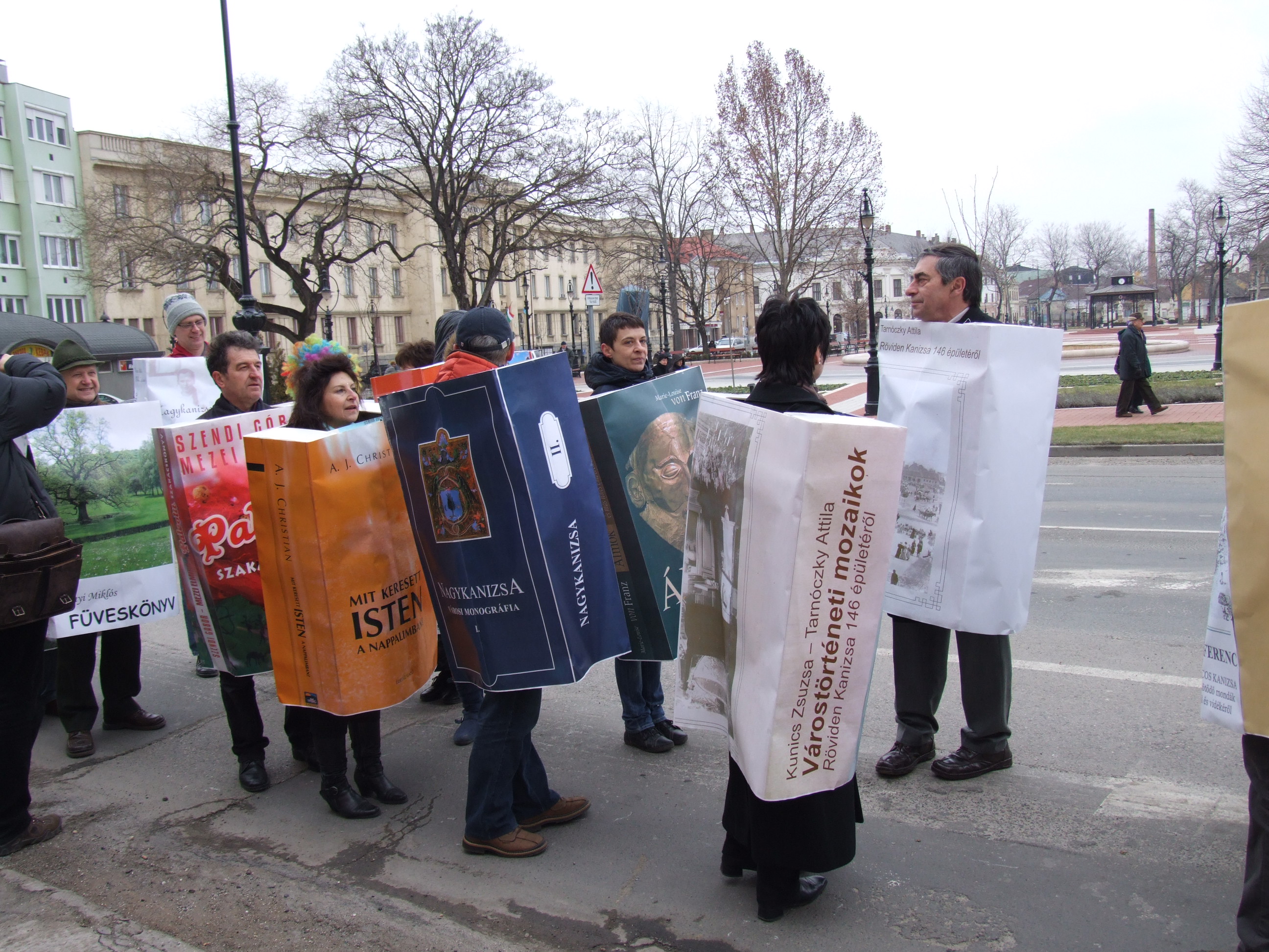 Nyilvános 1011 | 1340 | 2013. február 9. A farsangi fánkfesztiválra készülve felhívásban kértük olvasóinkat, hogy öltsék magukra kedves könyvüket. Egy „könyvespolcnyi” jelentkező vette magára kedves olvasmányát, az ő vonulásukról készültek ezek a képek. A környezetükben néhol láthatók a Nagykanizsai Gólyalábasok, akik szintén a könyvtárhoz kötődnek. A „felvonuló kötetek” a könyvtár épületében még megtekinthetők. | |