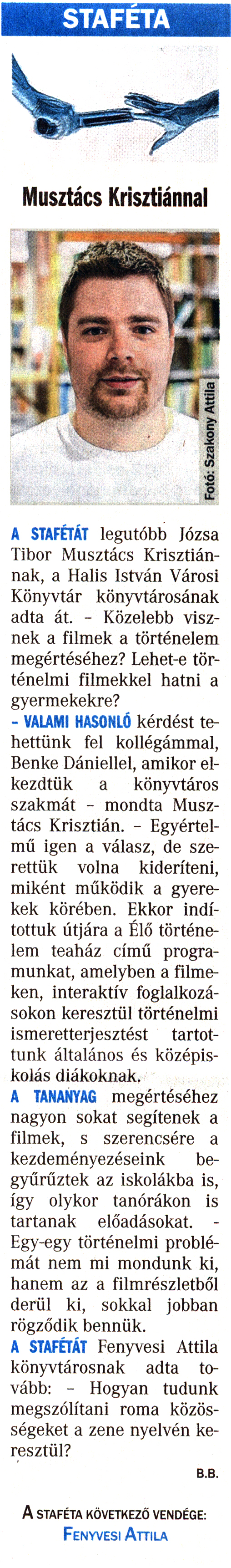 Nyilvános 1788 | 4469 | Vasárnapi Zalai Hírlap 2017. május 27. 21. szám 5. oldal | STAFÉTA Musztács Krisztiánnal A STAFÉTÁT legutóbb Józsa Tibor Musztács Krisztiánnak, a Halis István Városi Könyvtár könyvtárosának adta át. - Közelebb visznek a filmek a történelem megértéséhez? Lehet-e történelmi filmekkel hatni a gyermekekre? - VALAMI HASONLÓ kérdést tehettünk fel kollégámmal, Benke Dániellel, amikor elkezdtük a könyvtáros szakmát - mondta Musztács Krisztián. - Egyértelmű igen a válasz, de szerettük volna kideríteni, miként működik a gyerekek körében. Ekkor indítottuk útjára a Élő történelem teaház című programunkat, amelyben a filmeken, interaktív foglalkozásokon keresztül történelmi ismeretterjesztést tartottunk általános és középiskolás diákoknak. A TANANYAG megértéséhez nagyon sokat segítenek a filmek, s szerencsére a kezdeményezéseink begyűrűztek az iskolákba is, így olykor tanórákon is tartanak előadásokat. - Egy-egy történelmi problémát nem mi mondunk ki, hanem az a filmrészletből derül ki, sokkal jobban rögződik bennük. A STAFÉTÁT Fenyvesi Attila könyvtárosnak adta tovább: - Hogyan tudunk megszólítani roma közösségeket a zene nyelvén keresztül? B.B. A STAFÉTA KÖVETKEZŐ VENDÉGE: Fenyvesi Attila |