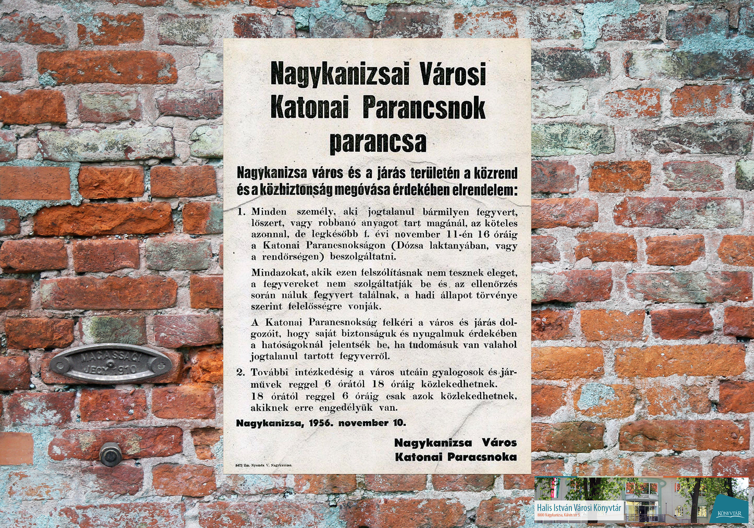 Nyilvános 1288 | 2104 | Az 1956-os forradalom leverése után | Október 23-i kiállításunk képei közül az időrendben következőt mutatjuk be. Az előző két szórólap a forradalmi szervek dokumentuma volt. Most egy falragasz következik, ez azonban már a forradalom leverése után készült. A szovjet csapatok 1956. november 5-én szállták meg Nagykanizsát, november 7-én el is hagyták a várost. A helyi katonai parancsnok ezek után tett közzé ezt az utasítását. Kattintson a képre! |