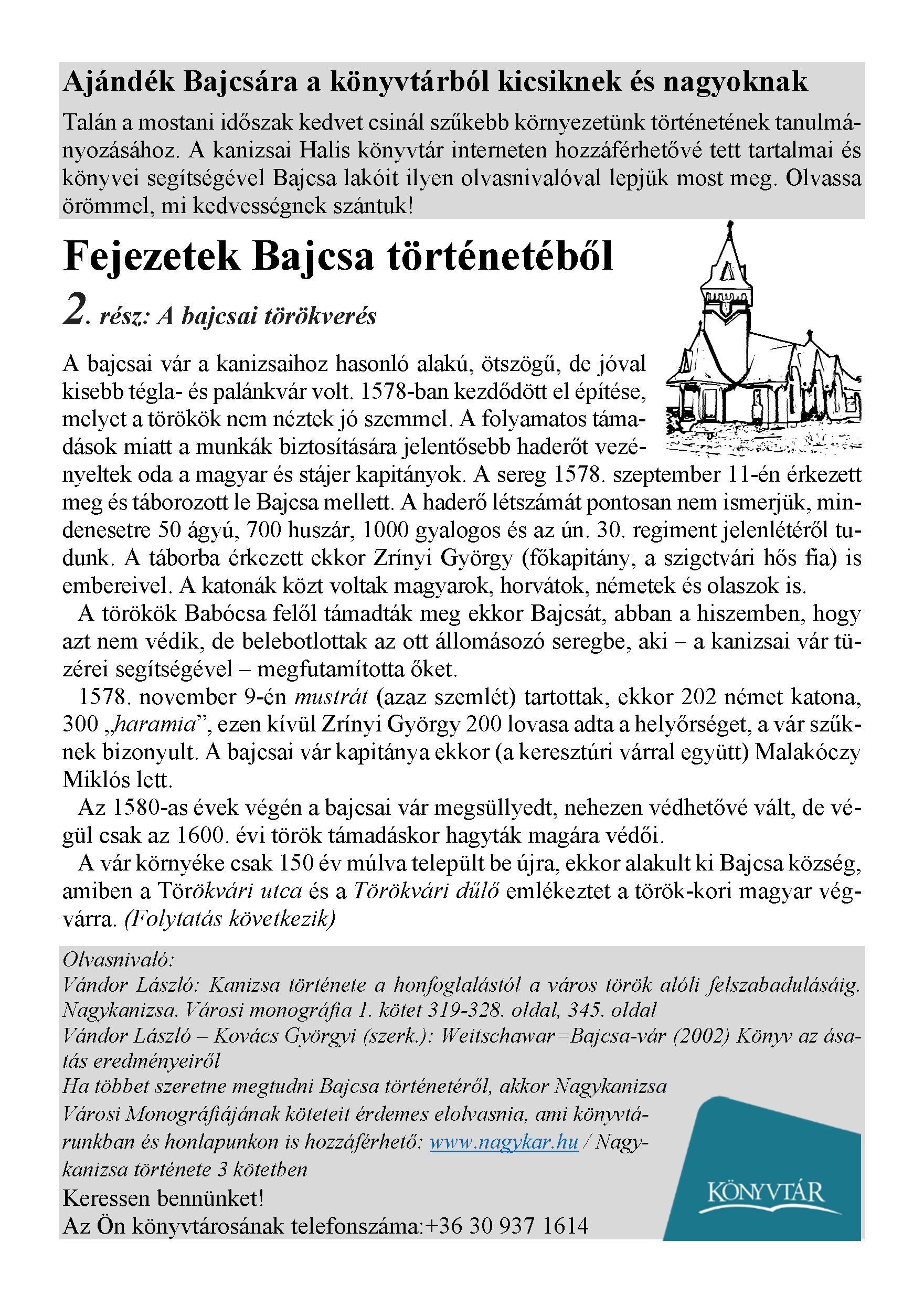 Nyilvános 1873 | 3138 | Megjelent: 2021. április 9. | Ajándék Bajcsára a könyvtárból kicsiknek és nagyoknak Talán a mostani időszak kedvet csinál szűkebb környezetünk történetének tanulmányozásához. A kanizsai Halis könyvtár interneten hozzáférhetővé tett tartalmai és könyvei segítségével Bajcsa lakóit ilyen olvasnivalóval lepjük most meg. Olvassa örömmel, mi kedvességnek szántuk! Fejezetek Bajcsa történetéből 2. rész: A bajcsai törökverés A bajcsai vár a kanizsaihoz hasonló alakú, ötszögű, de jóval kisebb tégla- és palánkvár volt. 1578-ban kezdődött el építése, melyet a törökök nem néztek jó szemmel. A folyamatos támadások miatt a munkák biztosítására jelentősebb haderőt vezényeltek oda a magyar és stájer kapitányok. A sereg 1578. szeptember 11-én érkezett meg és táborozott le Bajcsa mellett. A haderő létszámát pontosan nem ismerjük, mindenesetre 50 ágyú, 700 huszár, 1000 gyalogos és az ún. 30. regiment jelenlétéről tudunk. A táborba érkezett ekkor Zrínyi György (főkapitány, a szigetvári hős fia) is embereivel. A katonák közt voltak magyarok, horvátok, németek és olaszok is. A törökök Babócsa felől támadták meg ekkor Bajcsát, abban a hiszemben, hogy azt nem védik, de belebotlottak az ott állomásozó seregbe, aki – a kanizsai vár tüzérei segítségével – megfutamította őket. 1578. november 9-én mustrát (azaz szemlét) tartottak, ekkor 202 német katona, 300 „haramia”, ezen kívül Zrínyi György 200 lovasa adta a helyőrséget, a vár szűknek bizonyult. A bajcsai vár kapitánya ekkor (a keresztúri várral együtt) Malakóczy Miklós lett. Az 1580-as évek végén a bajcsai vár megsüllyedt, nehezen védhetővé vált, de végül csak az 1600. évi török támadáskor hagyták magára védői. A vár környéke csak 150 év múlva települt be újra, ekkor alakult ki Bajcsa község, amiben a Törökvári utca és a Törökvári dűlő emlékeztet a török-kori magyar végvárra. (Folytatás következik) Olvasnivaló: Vándor László: Kanizsa története a honfoglalástól a város török alóli felszabadulásáig. Nagykanizsa. Városi monográfia 1. kötet 319-328. oldal, 345. oldal Vándor László – Kovács Györgyi (szerk.): Weitschawar=Bajcsa-vár (2002) Könyv az ásatás eredményeiről Ha többet szeretne megtudni Bajcsa történetéről, akkor Nagykanizsa Városi Monográfiájának köteteit érdemes elolvasnia, ami könyvtá- runkban és honlapunkon is hozzáférhető: www.nagykar.hu / Nagy- kanizsa története 3 kötetben Keressen bennünket! |