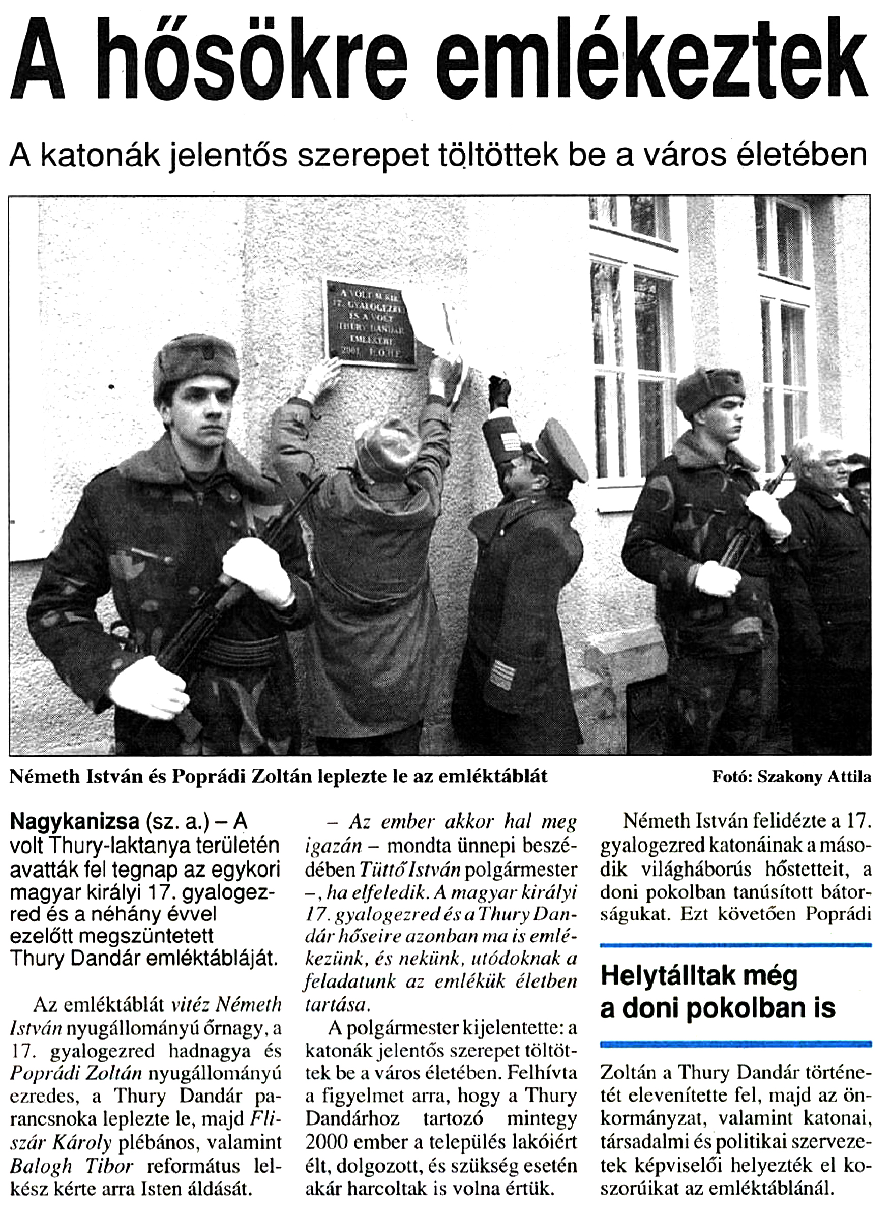 Nyilvános 1053 | 1476 | Zalai Hírlap 2001. november 13. 5. oldal | A hősökre emlékeztek A katonák jelentős szerepet töltöttek be a város életében Németh István és Poprádi Zoltán leplezte le az emléktáblát Fotó: Szakony Attila Nagykanizsa (sz. a.) - A volt Thury-laktanya területén avatták fel tegnap az egykori magyar királyi 17. gyalogezred és a néhány évvel ezelőtt megszüntetett Thury Dandár emléktábláját. Az emléktáblát vitéz Németh István nyugállományú őrnagy, a 17. gyalogezred hadnagya és Poprádi Zoltán nyugállományú ezredes, a Thury Dandár parancsnoka leplezte le, majd Fiiszár Károly plébános, valamint Balogh Tibor református lelkész kérte arra Isten áldását. - Az ember akkor hal meg igazán - mondta ünnepi beszédében Tüttő István polgármester -, ha elfeledik. A magyar királyi 17. gyalogezred és a Thury Dandár hőseire azonban ma is emlékezünk, és nekünk, utódoknak a feladatunk az emlékük életben tartása. A polgármester kijelentette: a katonák jelentős szerepet töltöttek be a város életében. Felhívta a figyelmet arra, hogy a Thury Dandárhoz tartozó mintegy 2000 ember a település lakóiért élt, dolgozott, és szükség esetén akár harcoltak is volna értük. Németh István felidézte a 17. gyalogezred katonáinak a második világháborús hőstetteit, a doni pokolban tanúsított bátorságukat. Ezt követően Poprádi Zoltán a Thury Dandár történetét elevenítette fel, majd az önkormányzat, valamint katonai, társadalmi és politikai szervezetek képviselői helyezték el koszorúikat az emléktáblánál. |