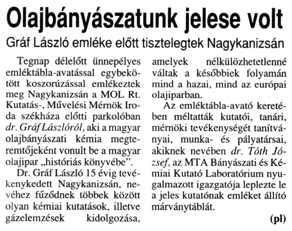 Nyilvános 842 | 1220 | Zalai Hírlap 1999. július 9. 4. oldal | Olajbányászatunk jelese volt Gráf László emléke előtt tisztelegtek Nagykanizsán Tegnap délelőtt ünnepélyes emléktábla-avatással egybekötött koszorúzással emlékeztek meg Nagykanizsán a MOL Rt. Kutatás-, Művelési Mérnök Iroda székháza előtti parkolóban dr. Gráf Lászlóról, aki a magyar olajbányászati kémia megteremtőjeként vonult be a magyar olajipar „históriás könyvébe”. Dr. Gráf László 15 évig tevékenykedett Nagykanizsán, nevéhez fűződnek többek között olyan kémiai kutatások, illetve gázelemzések kidolgozása, amelyek nélkülözhetetlenné váltak a későbbiek folyamán mind a hazai, mind az európai olajiparban. Az emléktábla-avató keretében méltatták kutatói, tanári, mérnöki tevékenységét tanítványai, munka- és pályatársai, akiknek nevében dr. Tóth József, az MTA Bányászati és Kémiai Kutató Laboratórium nyugalmazott igazgatója leplezte le a jeles kutatónak emléket állító márványtáblát. (pl) |